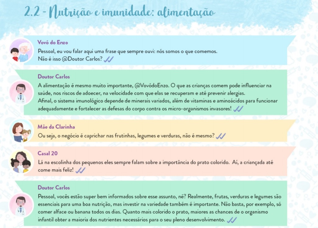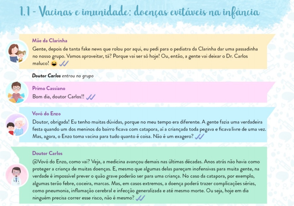 Na cartilha, as respostas são formuladas como uma conversa fictícia em grupo de WhatsApp da família da Clarinha, que têm muitas dúvidas sobre a criação dos pequenos. O médico, Doutor Carlos, é adicionado ao grupo pela mãe da Clarinha e passa a responder à Tia Cris, o Primo Cassiano e até a Vovó do Enzo, em uma linguagem simples e com todas as informações necessárias sobre cada um dos assuntos.