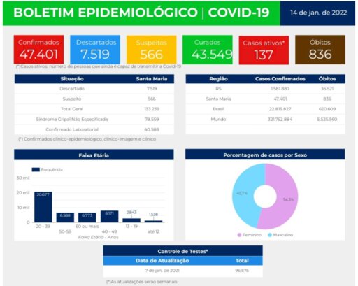 O número de casos confirmados de Covid-19 em Santa Maria tem aumentado nos últimos dias. De acordo com o último boletim epidemiológico divulgado pela prefeitura, atualizado na sexta-feira, já são 47.401 casos confirmados na cidade, 459 a mais em relação ao documento anterior, de quinta-feira, que havia registrado 46.942.