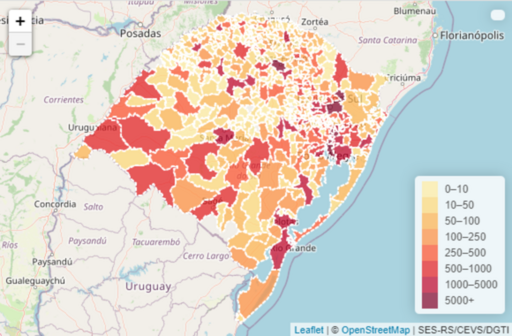 A incidência da doença na população gaúcha é de 1.536,2 casos para cada 100 mil habitantes. A ocupação de leitos em todo o Estado é de 74,4%, conforme o boletim. Dos 497 municípios, apenas 7 ainda não possuem casos confirmados da doença. Na Região Central, todos já tiveram pelo menos um caso registrado.