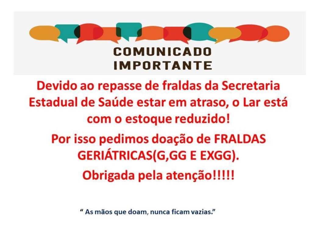 Quem puder colaborar com as fraldas geriátrica com tamanhos G, GG e EGG, pode levar diretamente no Lar ou ligar para combinar a entrega.