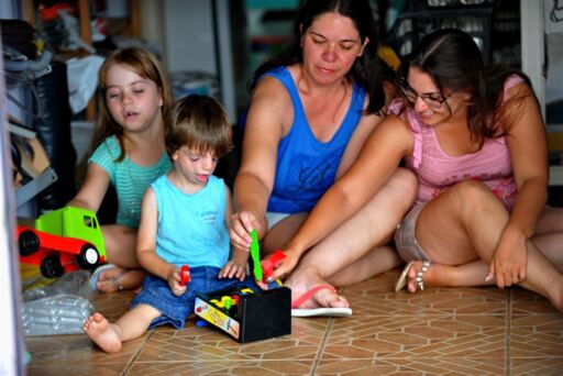 Foto: Charles Guerra (Diário)/ Durante o dia, Murilo brinca com a irmã Karen de 7 anos, a mãe Kellen (de azul) e a madrinha Ingrid