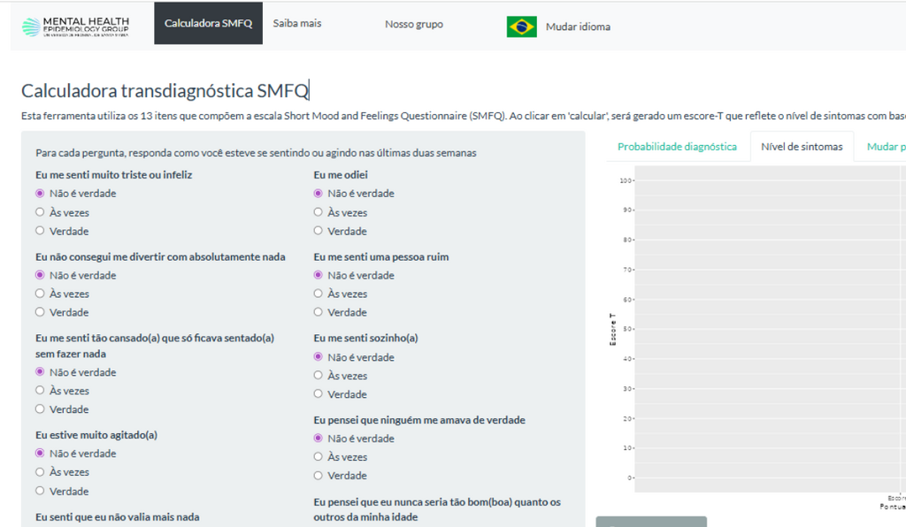 A calculadora utiliza as respostas às 13 questões do SMFQ, que investigam sintomas como tristeza, falta de prazer, cansaço, baixa autoestima e pensamentos negativos.