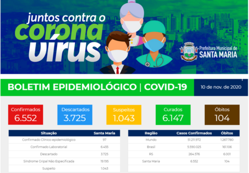 O boletim epidemiológico de Santa Maria, atualizado na terça-feira, registrou 44 novos casos confirmados de Covid-19. Desde o início da pandemia, a cidade tem 6.552 casos de coronavírus e 98 óbitos associados à doença.