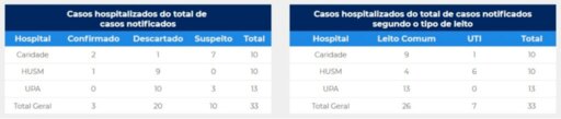 Pelo Sistema Único de Saúde (SUS) são 95 leitos destinados a pacientes com suspeita ou confirmação da doença, sendo 30 de Unidade de Terapia Intensiva (UTI). De acordo com o último boletim epidemiológico emitido pela prefeitura, até a segunda-feira, 33 pacientes seguiam hospitalizados na cidade, do total de casos notificados até agora (veja a situação das hospitalizações abaixo). Desses 33, 26 estão internados em leitos comuns e sete estão em UTI. Dos hospitalizados, são três casos confirmados, 10 suspeitos e 20 descartados.
