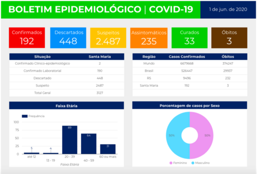 Santa Maria não registrou novos casos de coronavírus nas últimas 24 horas e segue com 192 diagnósticos positivos. Há, ainda, 2.487 suspeitas, 448 possibilidades descartadas. Dos 192, 33 já estão recuperados. Três pessoas morreram por Covid-19 na cidade.