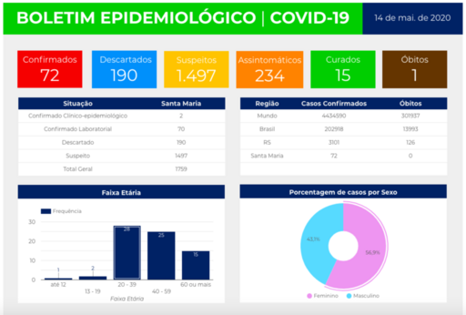 Nesta quinta-feira, Santa Maria registrou um novo caso de coronavírus e o primeiro óbito causado pela doença no município. A cidade tem 1.497 suspeitas da Covid-19, 190 casos descartados e 15 pessoas consideradas recuperadas.