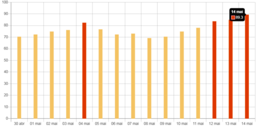 Quanto aos leitos clínicos, o indicador também segue elevado. Ontem, a taxa era de 83,6%. Havia 133 pacientes para 159 leitos Covid.