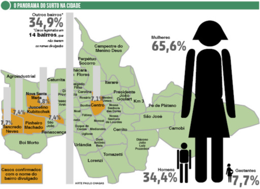 No relatório, consta ainda que outras 123 pessoas estão com a doença, porém, não foi informado o bairro onde moram, das outras 108 pessoas ainda não há informação. Quanto à distribuição dos casos por bairros, a assessoria de comunicação social da Secretaria de Saúde do Estado confirma a informação dos 19 bairros.