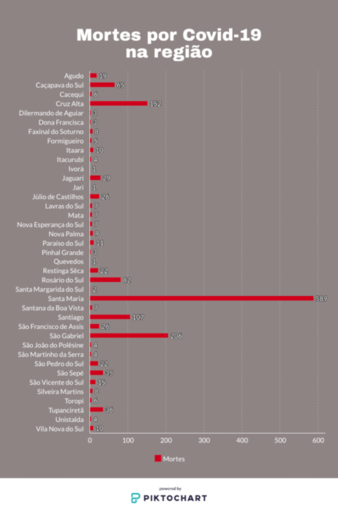 As cidades que têm apenas um óbito são Ivorá, Jari e Quevedos. As informações têm como base as prefeituras de cada cidade. Somadas todas as cidades, a região tem 1.562 mortes causadas pela pandemia.