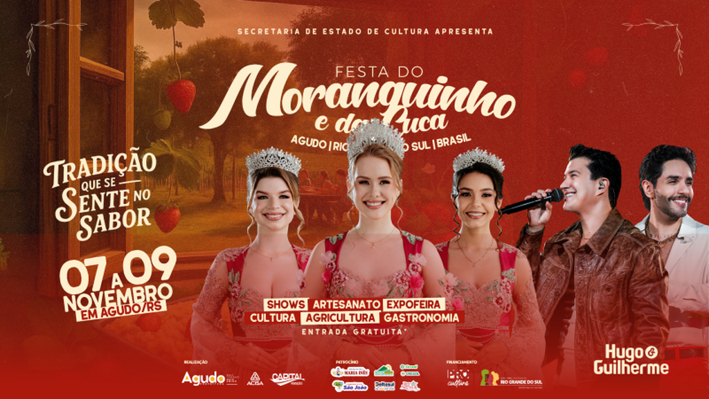 Entre os dias 7 e 9 de novembro, o município de Agudo (RS) será palco de uma das celebrações mais queridas da região central do Estado: a 27ª Festa do Moranguinho e da Cuca. O evento, que já é tradição no calendário cultural e turístico do Rio Grande do Sul, promete um fim de semana de intensa programação com shows nacionais, feira de expositores, gastronomia colonial, artesanato, parque de diversões, apresentações culturais e festival infantil.
