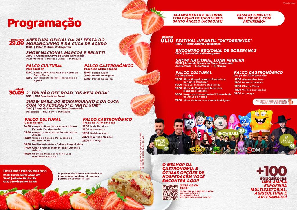 Agudo espera receber todos os moradores da região para comemorar os 25 anos da Festa do Moranguinho e da Cuca. Com uma programação eclética e a oportunidade de saborear morangos frescos e cucas deliciosas, este evento é uma experiência que combina o melhor da gastronomia, da música e cultural local em um ambiente festivo único.