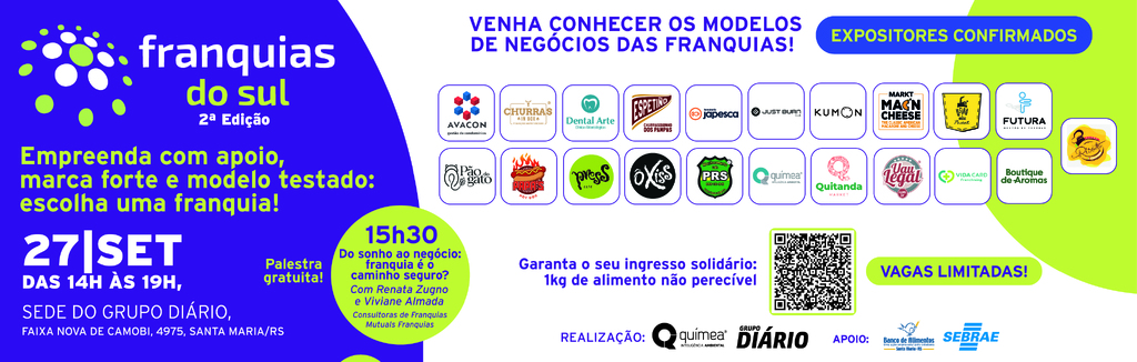 Santa Maria será novamente palco de um dos eventos mais relevantes do setor de franquias no interior do Brasil: o Franquias do Sul, que chega à sua segunda edição com uma proposta ainda mais robusta. Realizado pela Químea Inteligência Ambiental em parceria com o Grupo Diário, o evento conta com o apoio estratégico do Sebrae RS, que reforça seu papel como agente de transformação no ecossistema empreendedor.