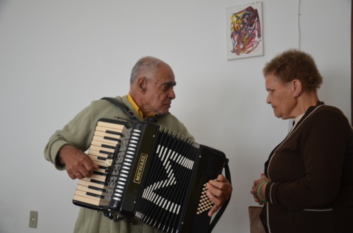 Marcelino, que adora tocar uma gaita, diz, orgulhoso, que foi com a música que conquistou a amada. Ele conta que tocava o instrumento e Almeirinha dançava ao lado dele.