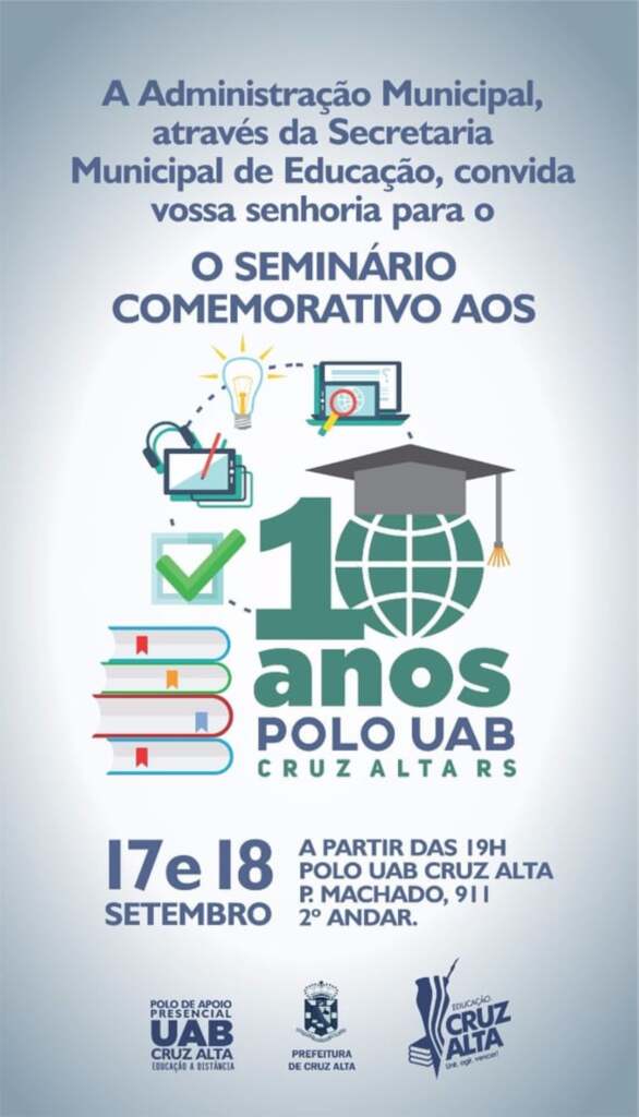 O sistema da Universidade Aberta do Brasil (UAB) está completando 10 anos em Cruz Alta em 2018, e, para marcar esta ocasião, avaliar o que foi feito e planejar os próximos 10 anos, ocorre um Seminário Comemorativo. O evento começa hoje e vai até quinta-feira na sede do Polo, e contará com discussões sobre o sistema, painéis e apresentação de trabalhos. A programação envolverá palestras com temas como Neurociência da Aprendizagem, Inclusão e a história da UAB. Além disso, o evento contará com submissão e apresentação de trabalhos.