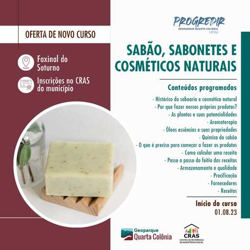 Seguem abertas as inscrições para os cursos “Sabão, Sabonetes e Cosméticos Naturais” e “Massas Artesanais e Possíveis Aplicações” do Programa Progredir Geoparque Quarta Colônia.