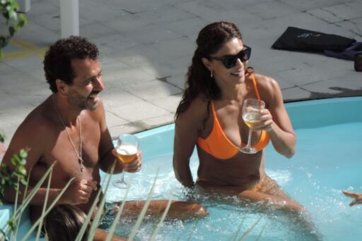 Atores Marcos Palmeira e Juliana Paes em momento de descontração na piscina do hotel em Jaguari