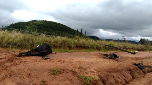 Ele conta que o poste que sustenta a rede elétrica já estava no chão, mas que seu pai não sabia que a situação apresentava risco à vida. No local, Diego viu que, além da novilha, um cachorro havia morrido e também duas aves, que teriam se aproximado para se alimentar dos cadáveres dos bichos.