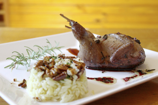 Tempere as codornas com o sal de ervas, meia taça de vinho porto e pimenta do reino à gosto - reserve por 6 horas em local resfriado. Em uma forma untada, com gordura clarificada, asse as aves por 25 minutos. Em uma panela (com lateral baixa ou sarten), coloque uma colher de manteiga, um pouco da gordura da forma, o alecrim e o restante do vinho porto. Cozinhe a codorna até dourar com a redução. Sirva acompanhado com arroz de nozes. Decore o prato com o azeite de ervas.