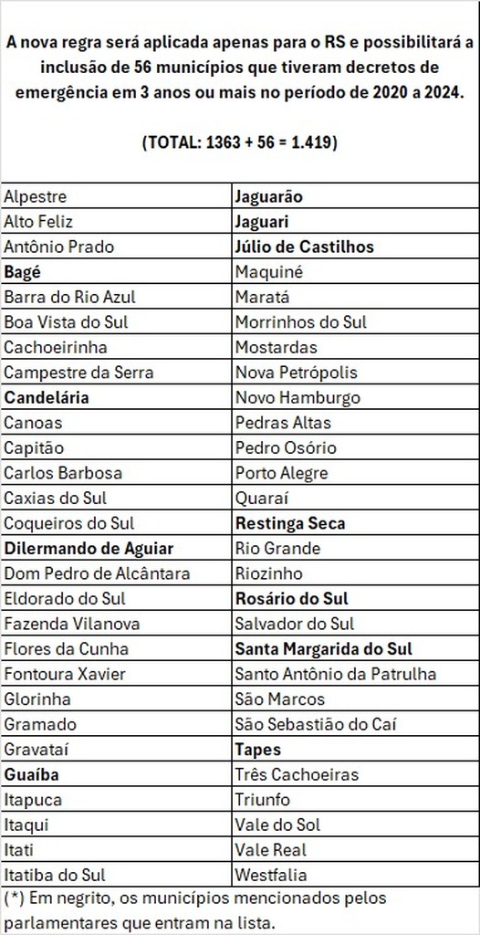 Depois de quase uma semana de intensas discussões e de inúmeras reuniões, os ministérios da Agricultura e da Fazenda encontraram uma solução para resolver o problema de municípios gaúchos que ficaram fora dos autorizados para a renegociação das dívidas dos produtores rurais. Segundo o deputado federal governista Paulo Pimenta (PT), para incluir municípios com grande quantidade de agricultores prejudicados e com grandes perdas devido às secas e catástrofes climáticas dos últimos anos, a saída foi mudar uma regra e permitir que sejam beneficiados os produtores de municípios que tiverem três decretos de emergência homologados entre 2020 e 2024. Com isso, devem ser incluídos 56 cidades que tinham ficado fora da lista original, publicada na semana passada.