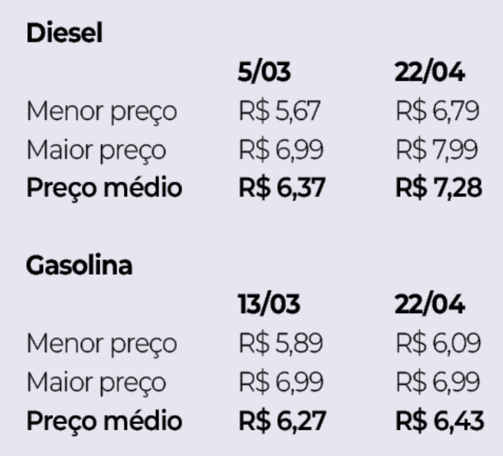 Pesquisa feita na quarta (22) pelo Diário, com base no aplicativo Menor Preço, do governo do Estado, indica que o óleo diesel subiu, em média, R$ 0,91 na cidade desde o começo de março, enquanto a gasolina ficou R$ 0,16 mais cara.