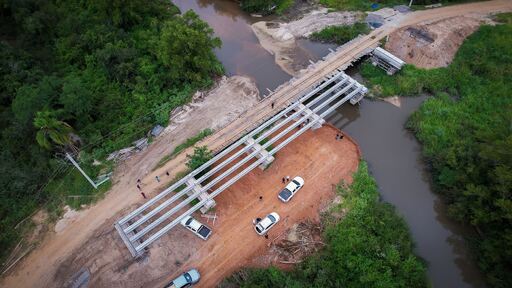 Antes, era de madeira e acabava sendo danificada pelo peso dos caminhões ou a cada enchente. Agora, será mais alta, mais comprida e muito mais resistente, de concreto. Os pilares foram concluídos, e as vigas quase todas instaladas.