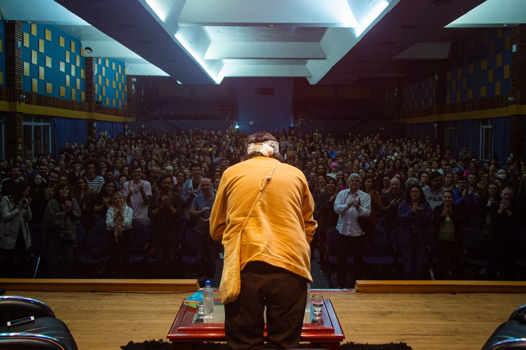O público acompanhava, muitos com os livros do autor em mãos, as longas reflexões do filósofo, que também falou sobre a invisibilidade dos povos indígenas em Santa Maria e mencionou outros pensadores e escritores como Mahatma Gandhi, Conceição Evaristo e Carlos Drummond de Andrade.