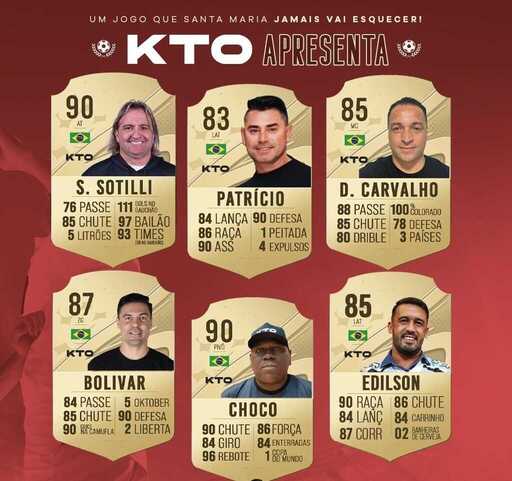 Entre os atletas que representam a KTO estão confirmados nomes como Patrício e Edilson, ex-Grêmio, Bolívar e Daniel Carvalho, ex-Inter, além de Sandro Sotilli, e do ex-craque do futsal Choco.