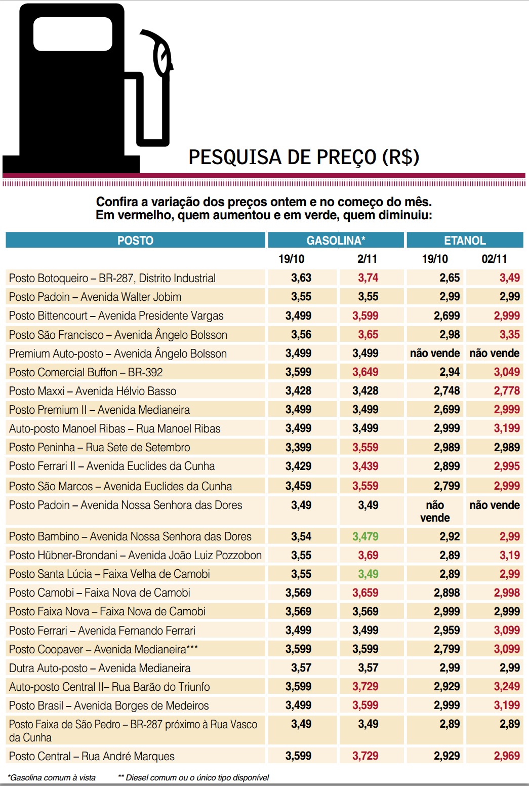O preço da gasolina, que tem 27,5% de álcool em sua composição, também sofreu reajustes. O valor está maior em 12 postos, dos 25 pesquisados. A comparação é com o dia 19 de outubro. O litro de gasolina varia entre R$ 3,428 e R$ 3,74, uma diferença de R$ 0,31. Na comparação, o etanol de maior valor está R$ 0,06 mais caro que a gasolina mais barata. Ainda, dois postos baixaram o preço: de R$ 3,54 para R$ 3,479, e de R$ 3,55 para R$ 3,49.