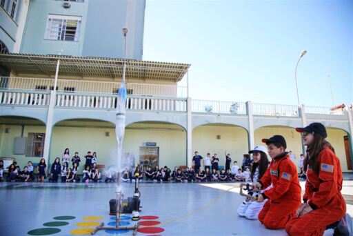 A atividade mais aguardada pelos estudantes foi o lançamento do foguete de água. Três alunos foram escolhidos para colocar a roupa de astronauta e lançar o foguete. O objeto é feito com materiais recicláveis, como garrafas PET e canos de PVC. Depois que ganha pressão, o gatilho é acionado, e o foguete é lançado em direção ao céu numa velocidade de 100 km/s, atingindo cerca de 20 metros de altura, tudo por meio das leis da física, ação e reação. Os paraquedas feitos de sacos plásticos amortecem a queda.