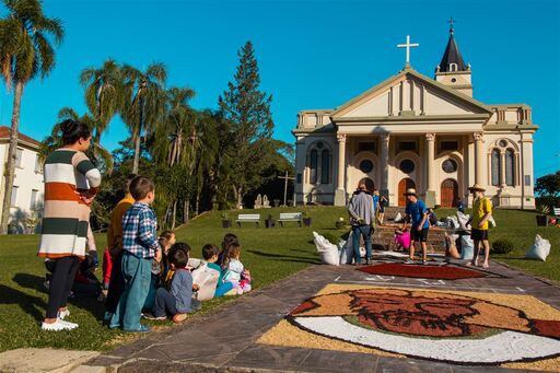 A 135° Festa de Corpus Christi de Vale Vêneto acontecerá nesta quinta-feira (8), a partir das 10h, com a tradicional missa na Igreja Matriz Corpus Christi. Ela será conduzida pelo Arcebispo Dom Leomar Brustolin. Após, ocorre a procissão pelas ruas da cidade, seguida do tradicional almoço, às 12h, no Salão Paroquial. Ainda à tarde, às 15h, haverá a missa com benção especial da saúde. Na quarta, a comunidade confeccionava os tapetes da celebração, trabalho pensado e preparado previamente.