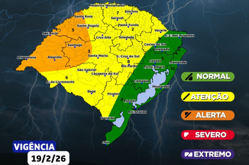 A Defesa Civil do Rio Grande do Sul emitiu aviso hidrometeorológico para esta quinta-feira (19) diante da atuação de uma área de baixa pressão que favorece a ocorrência de tempestades no Estado. O alerta atinge principalmente as regiões Oeste, Missões, Noroeste e Centro.