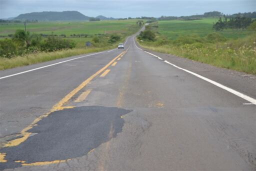 Enfim, como o Dnit conseguiu destrancar uma verba, foram retomados os tapa-buracos na BR-287, conforme a coluna antecipou recentemente. Essa cratera da foto acima, entre São Pedro do Sul e Mata, que estourou o pneu de vários carros até duas semanas atrás, está agora tapada com asfalto (veja foto abaixo), assim como a quase totalidade dos buracos na estrada, entre Santa Maria e São Vicente do Sul. Apesar de a rodovia ainda ter muitos trechos com imperfeições, ao menos agora não há tanto risco aos motoristas, que poderiam perder o controle do carro ao cair numa cratera.