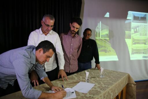 Arquiteto que venceu o concurso (em pé, de camisa rosa) participou da assinatura do contrato em Santa Maria ontem