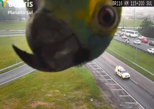 Na manhã desta sexta-feira, o circuito de segurança da BR-116, em Curitiba, no Paraná, flagrou um papagaio dando uma "espiada" em uma das câmeras. A espécie foi identificada como um papagaio de nome científico amazona aestiva. A empresa Arteris Planalto Sul, responsável pela administração dos mais de 412 quilômetros da rodovia, fazendo a ligação da capital paranaense à divisa dos estados de Santa Catarina e Rio Grande do Sul, publicou a imagem nas redes sociais. Assista ao vídeo clicando na imagem abaixo: