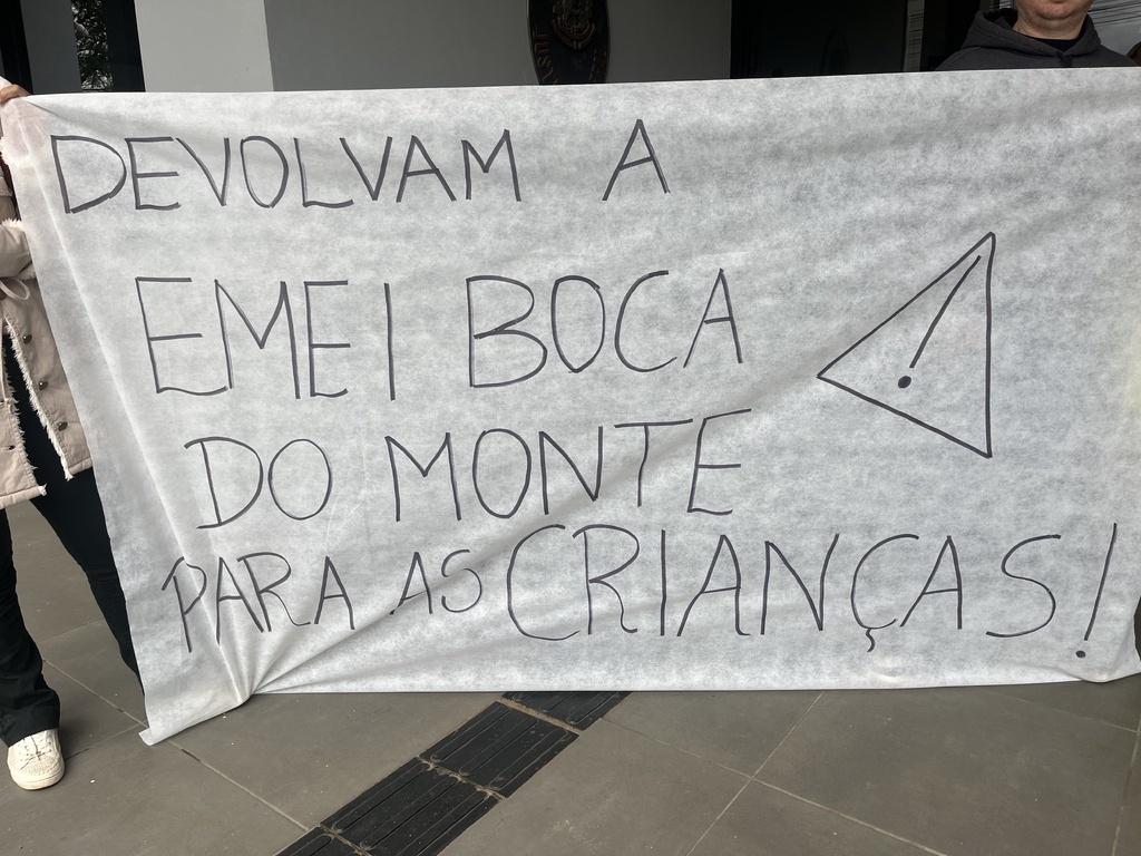 Pais e alunos da Emei levaram faixas e cartazes, manifestando-se contra a ocupação e a mudança das turmas para a Escola Estadual Almiro Beltrame.