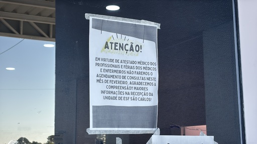 Pacientes atendidos pela Estratégia Saúde da Família (ESF) São Carlos, no Bairro Urlândia, em Santa Maria, relataram dificuldades para agendar novas consultas no início deste mês. Um aviso fixado na porta da unidade informa a suspensão do agendamento de atendimentos durante fevereiro, em razão de férias e afastamentos por atestado médico de profissionais. Conforme funcionários, as consultas já previamente marcadas continuam sendo realizadas normalmente, assim como os atendimentos de acolhimento.
