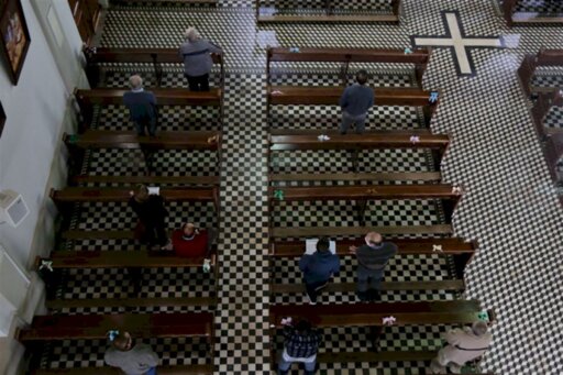 Com apenas 30% da capacidade do templo liberada, a missa foi transmitida ao vivo pela internet e por rádios locais. Um tripé com um celular, em frente ao altar, representava as centenas de pessoas que acompanhavam a celebração de casa.