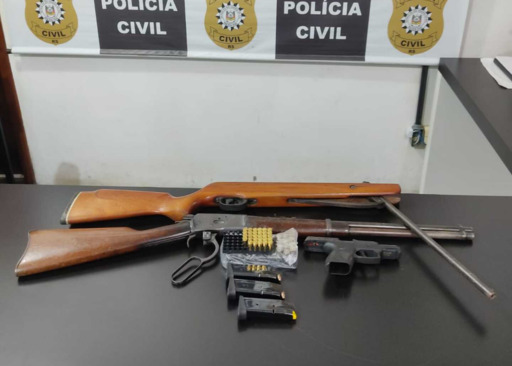 De acordo com a Polícia Civil, em uma oficina mecânica e em uma residência, no Bairro Pinheiro Machado, foram apreendidas uma carabina, uma arma de pressão e munições. Dois motores de automóveis com numeração raspada foram localizados no mesmo local.
