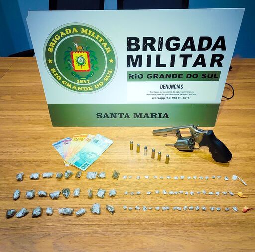 Na abordagem, foram apreendidos R$197,00 em espécie, um revólver calibre 38 com seis munições, 20 porções de crack, três porções de cocaína e mais de 50 porções de outros entorpecentes prontos para venda.