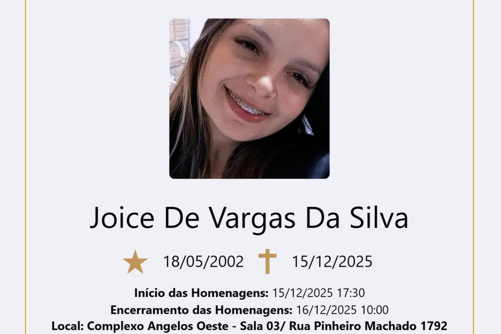 O velório de Joice de Vargas da Silva, 23 anos, morta a tiros na madrugada desta segunda-feira (15), em Cruz Alta, ocorre no Complexo Angelos Oeste, Sala 03, na Rua Pinheiro Machado, 1.792. A jovem pode ter sido vítima de feminicídio, segundo informações de familiares da vítima.