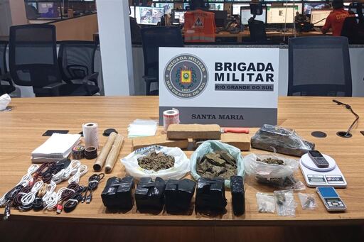 Entre os materiais apreendidos estavam cinco tabletes de maconha, uma porção de skunk, uma porção fracionada de maconha, uma porção de cristal sintético, um aparelho celular, diversas embalagens, quatro fitas isolantes, uma faca, duas balanças de precisão e 20 cabos carregadores.