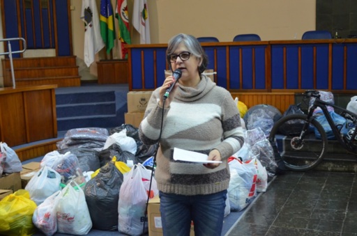 Com o auxílio de entidades parceiras - Grupos Desbravadores, Grupo Aventureiros, Igreja Adventista do Sétimo Dia, Banco de Alimentos e Associação Santa Maria Ciclismo (Asmec) -, o Legislativo arrecadou agasalhos e cobertores que foram entregues ao Lar Vila Itagiba. "A generosidade dos parceiros da Campanha do Agasalho possibilitou a atender mais pessoas em vulnerabilidade social", destacou a presidente Cida Brizola (PP, ao microfone), Drª Cida.