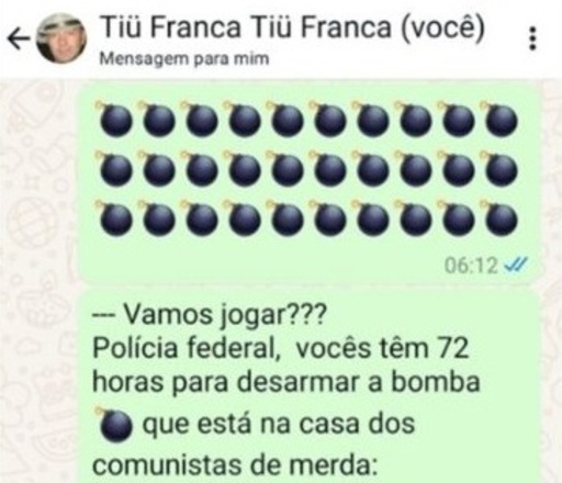 Em mensagens que foram enviadas em grupos no WhatsApp, Francisco Wanderley Luiz, 59 anos, o Tio França, alertava que estava preparando um ataque a bomba. No texto, ele relata: "Polícia Federal, vocês têm 72 horas para desarmar a bomba que está na casa dos comunistas de merda: William Bonner, José Sarney, Geraldo Alckmin, Fernando Henrique Cardoso". Segundo o imprensa da Capital Federal, ele seria o autor do atentado a bomba ao Congresso e ao STF, onde uma pessoa morreu. Apesar da suspeita, ainda não há confirmação oficial da identidade do autor do atentado.