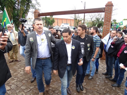Encarregado de cumprir a agenda do presidenciável Jair Bolsonaro (PSL), que se recupera de um atentado, o vice, general Antonio Hamilton Morão (PRTB, centro), fez campanha em Santiago, hoje..