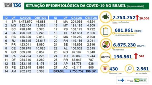 O Brasil chegou a marca de 196.561 mortes associadas à Covid-19. Em atualização desta segunda-feira, o país registra 7.753.752 milhões de casos confirmados da doença, sendo 20.006 mil registrados nos sistemas nacionais nas últimas 24h.