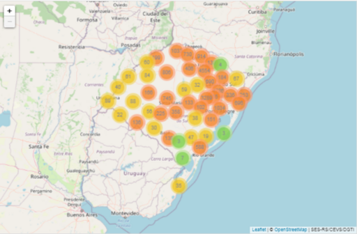 A incidência da doença no Estado é de 297,1 casos para cada 100 mil habitantes. A ocupação dos leitos clínicos e de UTI, de acordo com o boletim, é de 73,6%. Santa Maria segue ocupando a 10ª posição no ranking de municípios com o maior número de casos. Porto Alegre lidera a lista.