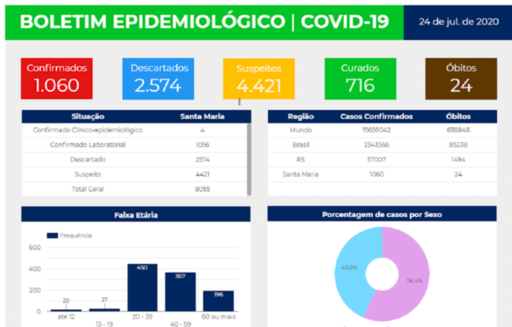 Santa Maria tem 1.060 casos confirmados de coronavírus. Foram 17 novos registros incluídos no boletim epidemiológico da prefeitura nesta sexta-feira. A cidade não registrou um novo óbito desde quinta e segue com 24 mortes. O número de recuperados é 716.