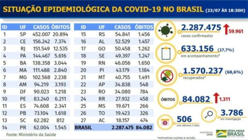 Nas últimas 24 horas, o boletim epidemiológico nacional registrou mais 59.962 novos casos positivos de Covid-19, junto com outros 1.311 óbitos. O número acumulado de casos confirmados desde o início da pandemia no Brasil chega a 2.228.475 e o de óbitos, 84.082 mortes.