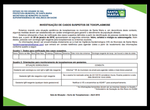 O documento intitulado "Investigação de casos suspeitos de toxoplasmose" falava no primeiro parágrafo que "Estamos vivendo uma situação epidêmica de toxoplasmose em Santa Maria". A assessoria prefeitura de Santa Maria informou nesta manhã, por meio de nota oficial, que irá esclarecer os fatos durante uma coletiva de imprensa às 14h30min para desmistificar boatos e orientar a população.