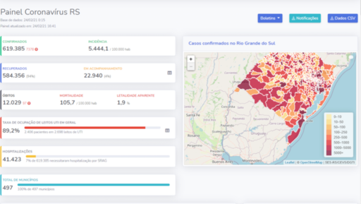 O total de casos confirmados no RS chegou a 619.385, sendo 584.357 (94% dos casos) considerados recuperados da doença.